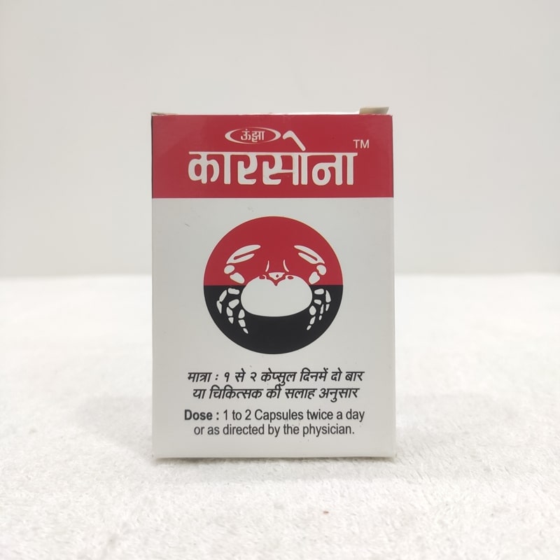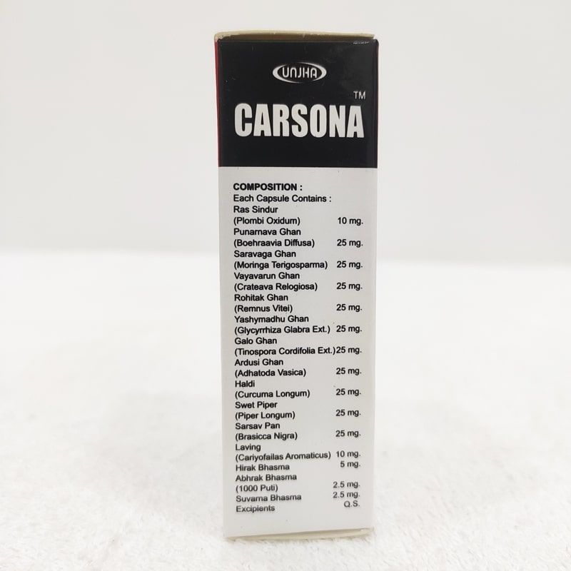 Unjha Carsona Capsules contains Hirak Bhasma, Abhrak Bhasma sahasraputi, Swarna Bhasma, Ras Sindur, Punarnava Ghan, Saragava Ghan, Vayavarun Ghan, Rohitak Ghan, Yasthimadhu Ghan, Galo Ghan, Ardusi Ghan, Haldi, Swet Piper, Sarsav Pan, Laving.